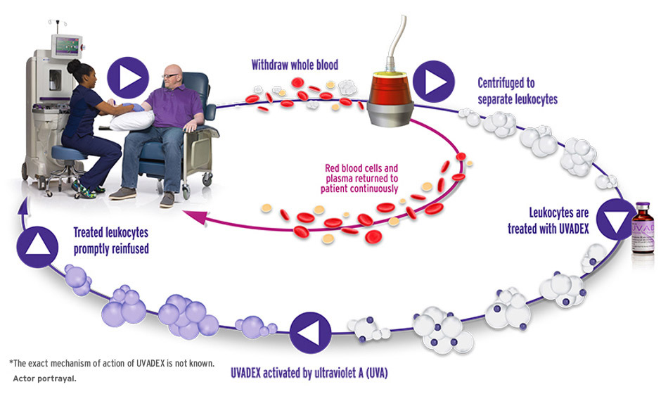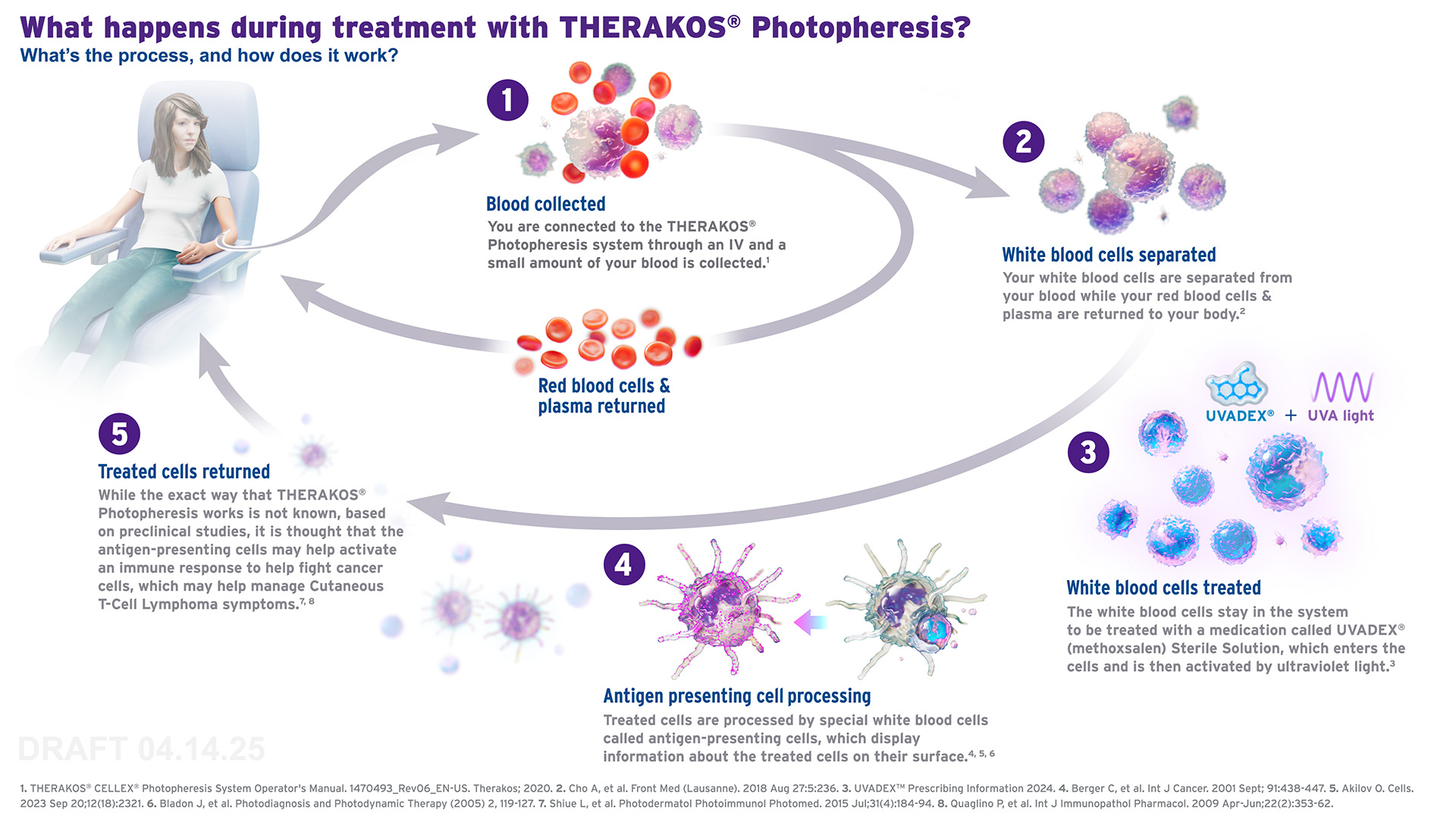 1. THERAKOS® CELLEX® Photopheresis System Operator’s Manual. 1470493_Rev06_EN-US. Therakos LLC; 2020. 2. UVADEX (methoxsalen) Sterile Solution (prescribing information). Therakos LLC. 3. Yoo EK, Rook AH, Elenitsas R, Gasparro FP, Vowels BR. Apoptosis induction by ultraviolet light A and photochemotherapy in cutaneous T-cell lymphoma: relevance to mechanism of therapeutic action. J Invest Dermatol. 1996;107(2):235-242. 4. Gerber A, Bohne M, Rasch J, Struy H, Ansorge S, GolInick H. Investigation of annexin V binding to lymphocytes after extracorporeaI photoimmunotherapy as an early marker of apoptosis. Dermatology. 2000;201(2):111-117. 5. Hwang ST, Janik JE, Jaffe ES, Wilson WH. Mycosis fungoides and Sézary syndrome. Lancet. 2008;371(9616):945-957. 6. Caffieri S, Di Lisa F, Bolesani F, et al. The mitochondrial effects of novel apoptogenic molecules generated by psoralen photolysis as a crucial mechanism in PUVA therapy. Blood. 2007;109(11):4988-4994. 7. Knobler R, Arenberger P, Arun A, et al. European dermatology forum – updated guidelines on the use of extracorporeal photopheresis 2020 – part 1. J Eur Acad Dermatol Venereol. 2020;34(12):2693-2716. 8. Hart JW, Shiue LH, Shpall EJ, Alousi AM. Extracorporeal photopheresis in the treatment of graft-versus-host disease: evidence and opinion. Ther Adv Hematol. 2013;4:320-334. 9. Craciun LI, Stordeur P, Schandené L, et al. Increased production of interleukin-10 and interleukin-1 receptor antagonist after extracorporeal photochemotherapy in chronic graft-versus-host disease. Transplantation. 2002;74:995-1000. 10. Caruso S, Poon IKH. Apoptotic cell-derived extracellular vesicles: more than just debris. Front Immunol. 2018;9:1486. 11. Tatsuno K, Yamazaki T, Hanlon D, et al. Extracorporeal photochemotherapy induces bona fide immunogenic cell death. Cell Death Dis. 2019;10:578. 12. Medina CB, Ravichandran KS. Do not let death us do part: 'find-me' signals in communication between dying cells and the phagocytes. Cell Death Differ. 2016;23(6):979-989. 13. Bisaccia E, Vonderheid EC, Geskin L. Safety of a new, single, integrated, closed photopheresis system in patients with cutaneous T-cell lymphoma. Br J Dermatol. 2009;161(1):167-169. 14. Marshall SR. Technology insight: ECP for the treatment of GvHD—can we offer selective immune control without generalized immunosuppression? Nat Clin Pract Oncol. 2006;3(6):302-314. 15. Morelli AE, Larregina AT, Shufesky WJ, et al. Internalization of circulating apoptotic cells by splenic marginal zone dendritic cells: dependence on complement receptors and effect on cytokine production. 2003;101:611-620. 16. Vieyra-Garcia PA, Wolf P. Extracorporeal photopheresis: a case of immunotherapy ahead of its time. Tranfus Med Hemother. 2020;47:226-234. 17. Shiue LH, Alousi AM, Wei C, Hosing CM, Duvic M, Ni X. Augmentation of blood dendritic cells by extracorporeal photopheresis in patients with leukemic cutaneous T-cell lymphoma and graft-versus-host disease. J Invest Dermatol. 2013;133(8):2098-2100.