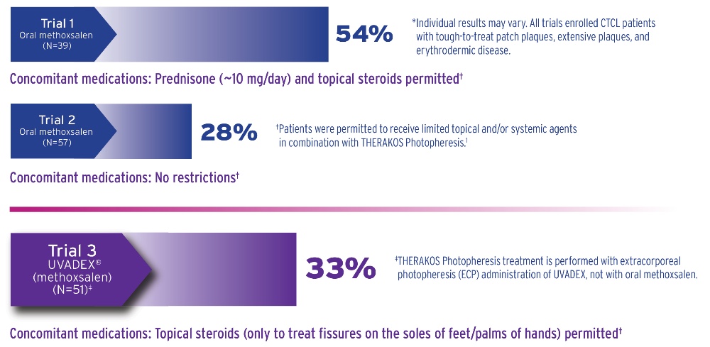 The higher response rate with oral methoxsalen in Trial 1 may be partly due to the coadministration of systemic steroids and patients receiving more extracorporeal photopheresis treatments (mean number of treatments: Trial 1=64; Trial 2=31; Trial 3=20)1